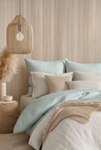 • Paleta: azules y verdes desaturados (pastel), blancos cálidos, madera clara.